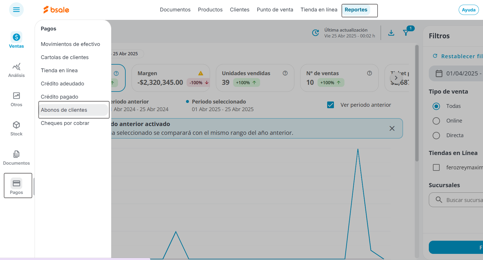 Si deseas ver los abonos a favor de tus clientes, ve a Reportes, haces clic en el sub menú Pagos y luego en Abonos de clientes.