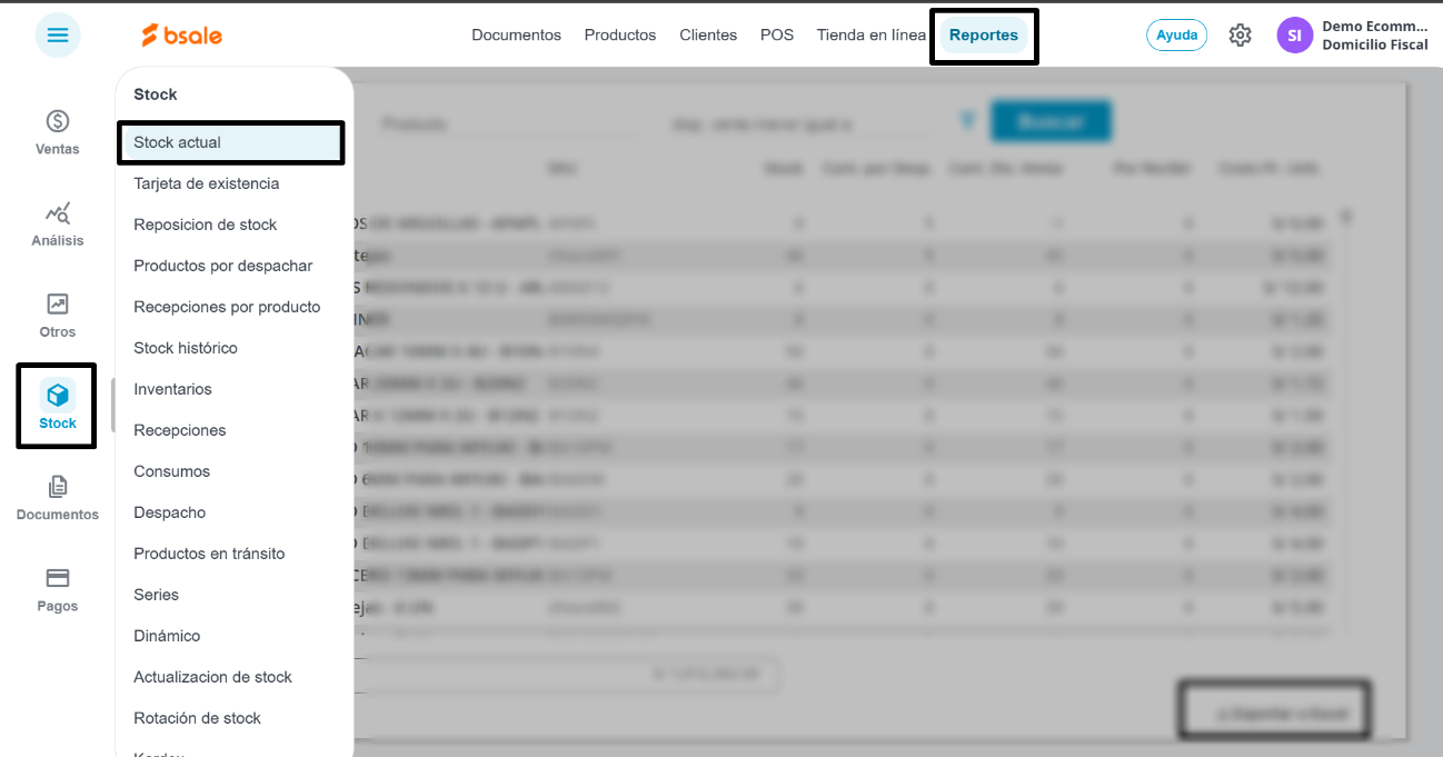 Debes ir a Reportes y luego Stock, finalmente, a Stock actual. En la parte inferior de la pantalla, conseguirás el botón de Exportar a Excel. Presiónalo y automáticamente se descargará el reporte de stock actual.