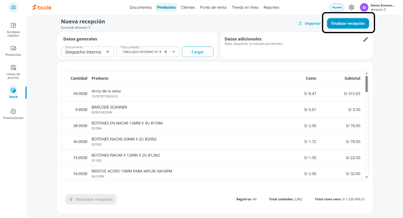 Ahora te aparecerá un resumen de todos los productos que se encuentran en la guía de despacho. Solo queda darle a Guardar y tus productos se sumarán al stock de la nueva sucursal.