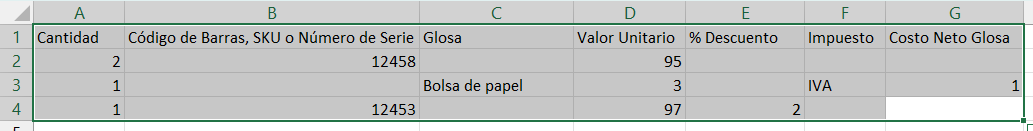 El formato a utilizar viene con los títulos, una descripción sobre cómo completar los datos y un ejemplo con 2 productos y una glosa. Si quieres saber que es una glosa y como configurarla mira el manual ¿Qué es una glosa?.