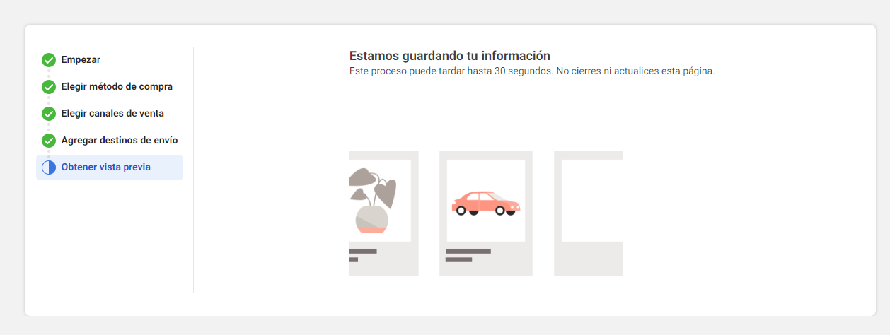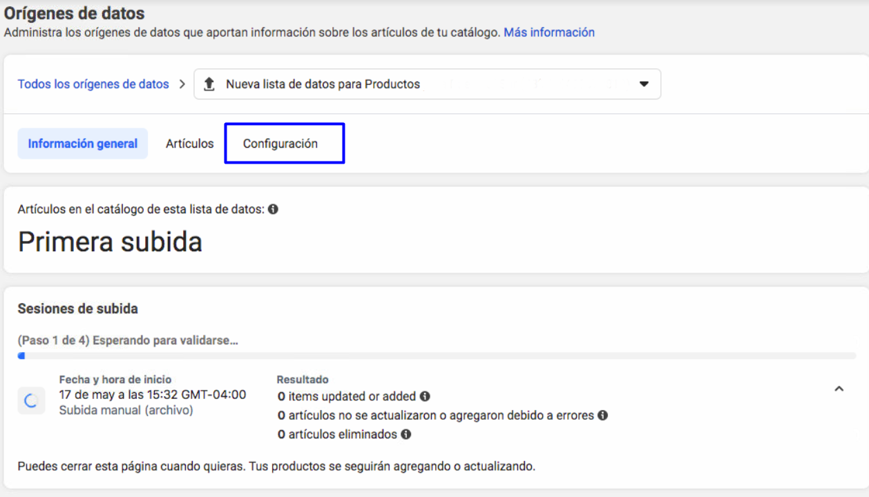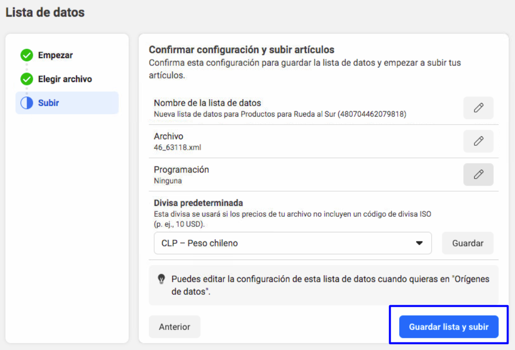 Presiona en Guardar lista y subir. Con eso comenzará la subida de los productos al catalogo de Facebook.
