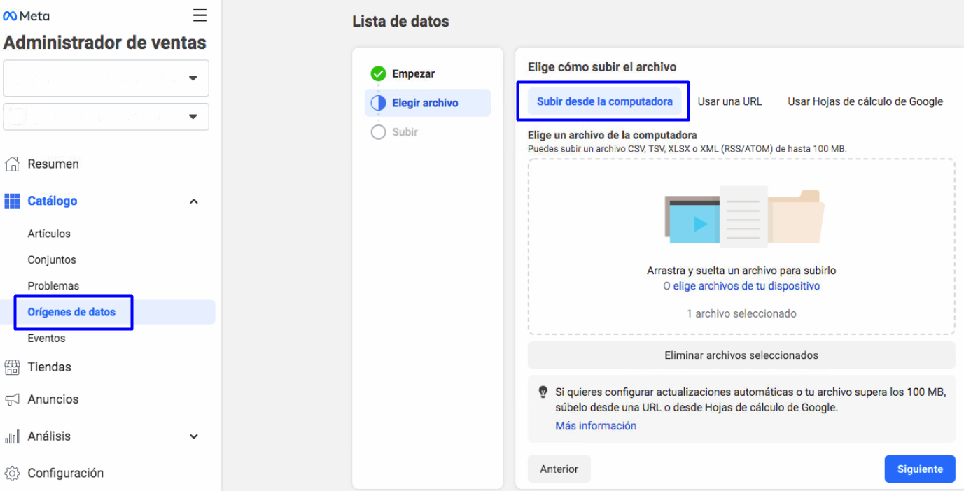 Ahora ve al Administrador de ventas en Facebook, en la sección Orígenes de datos selecciona Subir desde la computadora.