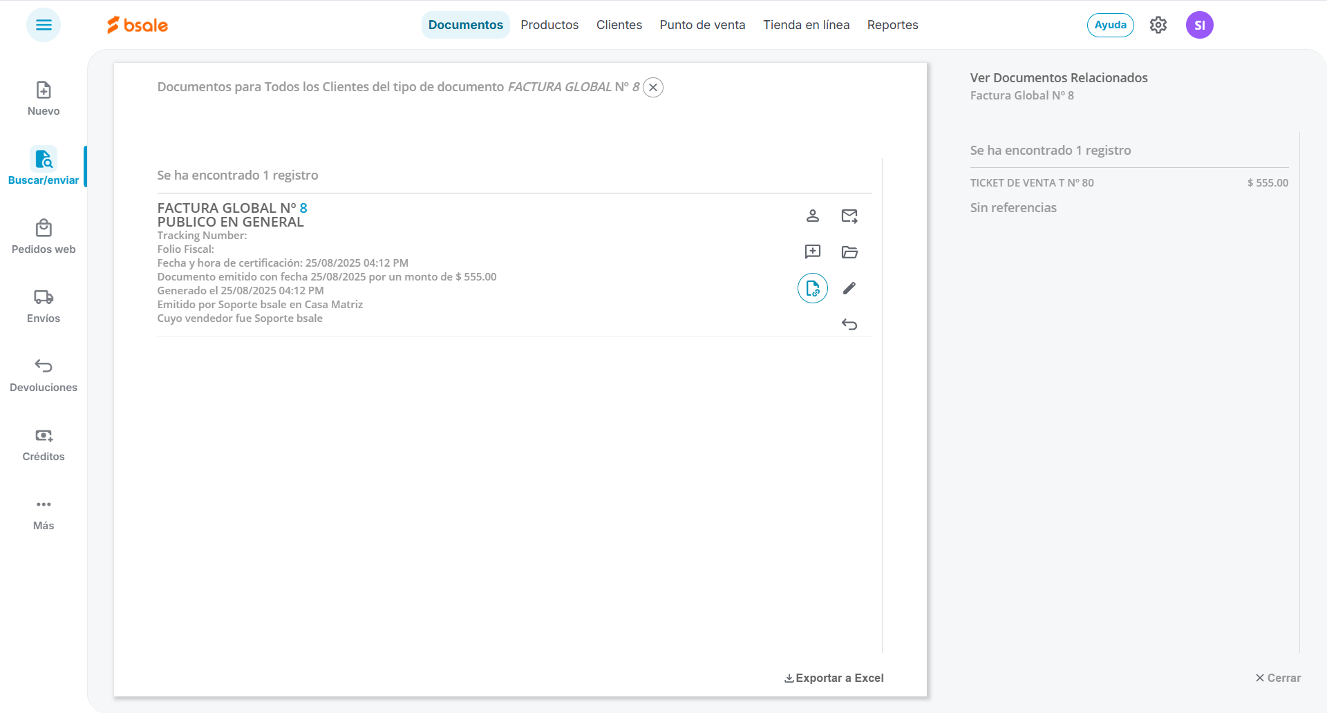 Para dar solución a este caso, Bsale permite realizar una Nota de crédito sobre el detalle del Ticket. Esta Nota de crédito quedará asociada tanto al ticket en Bsale como a la Factura Global ante SAT.