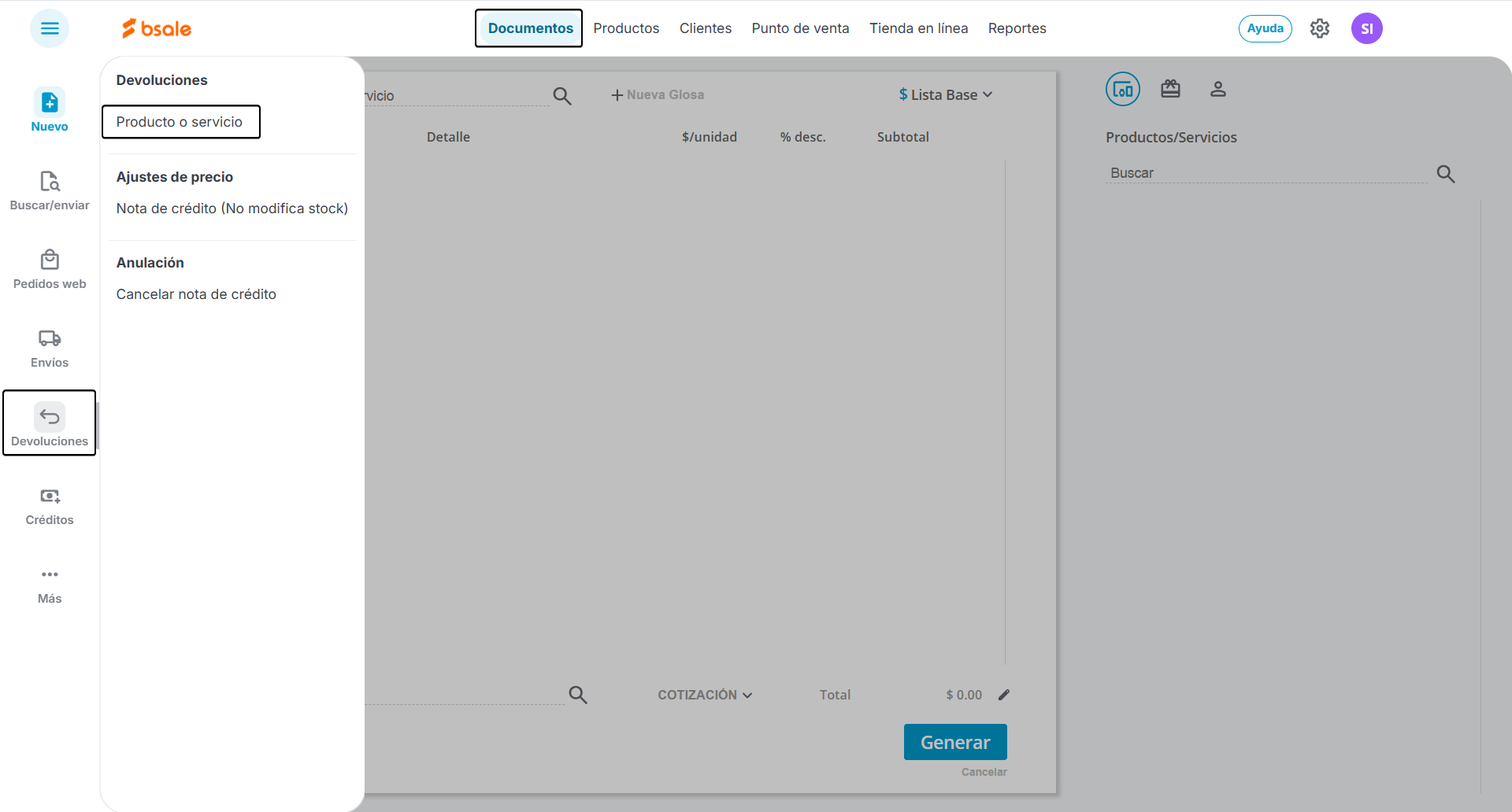 Vamos a Documentos, submenú Devoluciones y luego hacemos clic en Producto/Servicio.