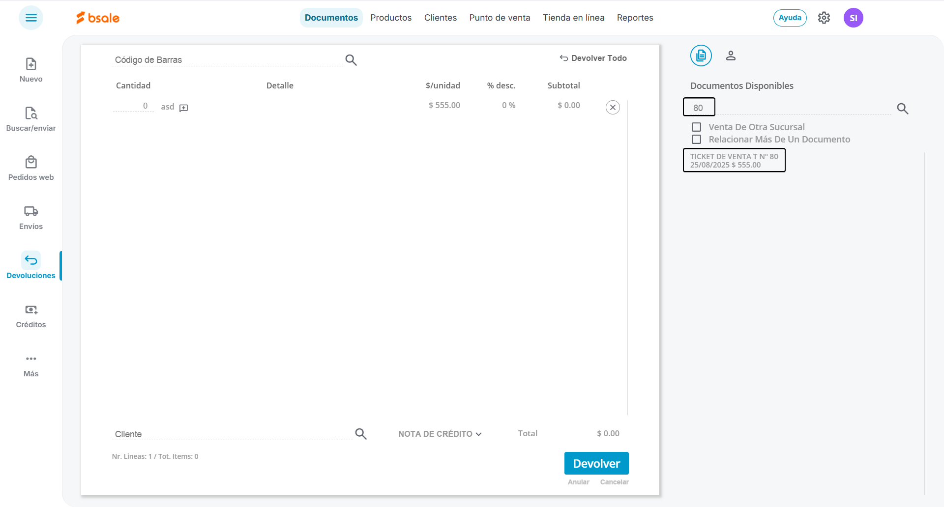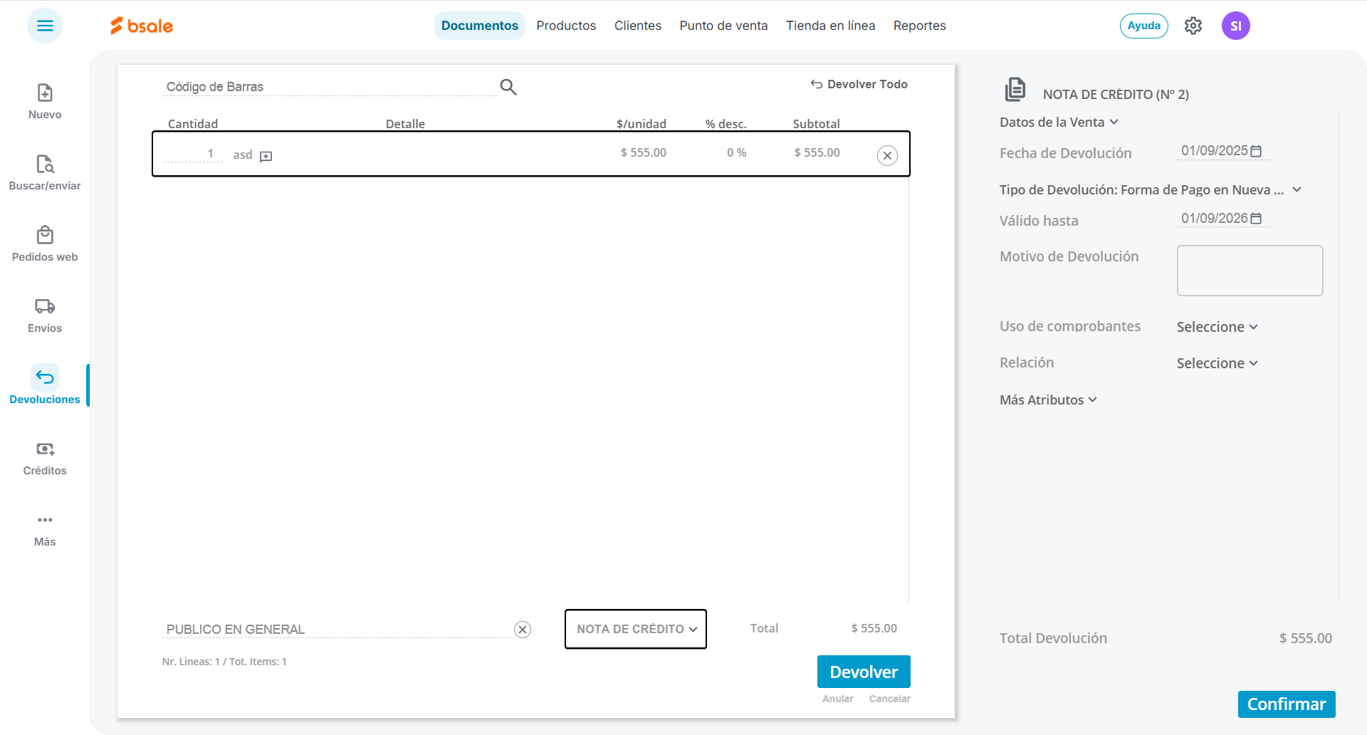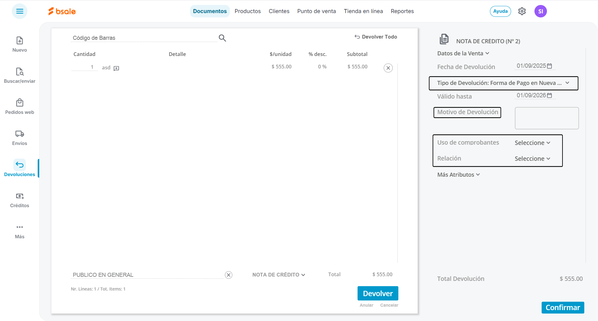 En la parte inferior verifica que el tipo de documento sea Nota de crédito y presionamos el botón Devolver.