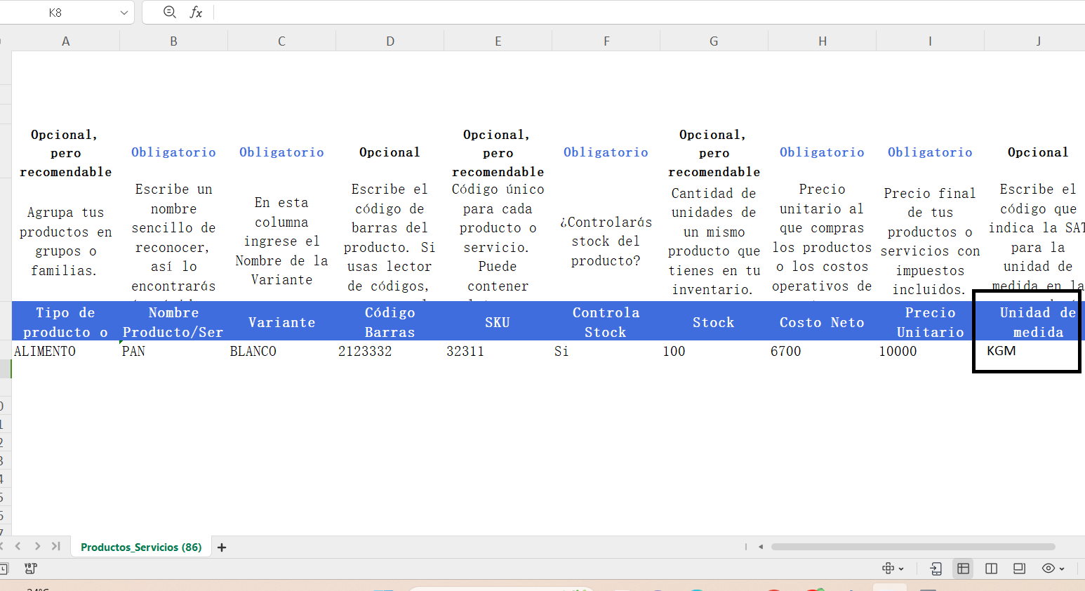 Nota: Si aún no sabes cómo hacer una carga masiva de productos, puedes seguir el manual de Importar productos de forma masiva a través de un archivo ExcelEn la planilla, debes escribir el código correspondiente a la unidad en la que vendes tu producto. Por ejemplo, si vendes pan por kilos, entonces en la fila correspondiente al producto "pan" debes escribir en la casilla de Unidad de medida el siguiente código: KGM