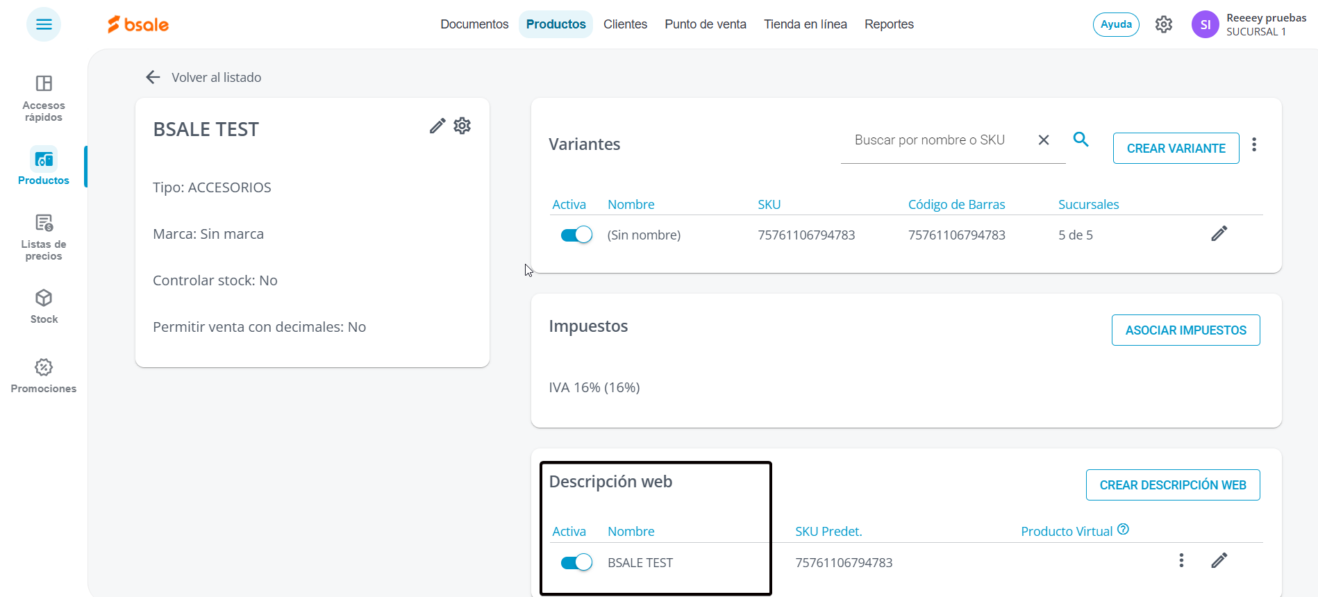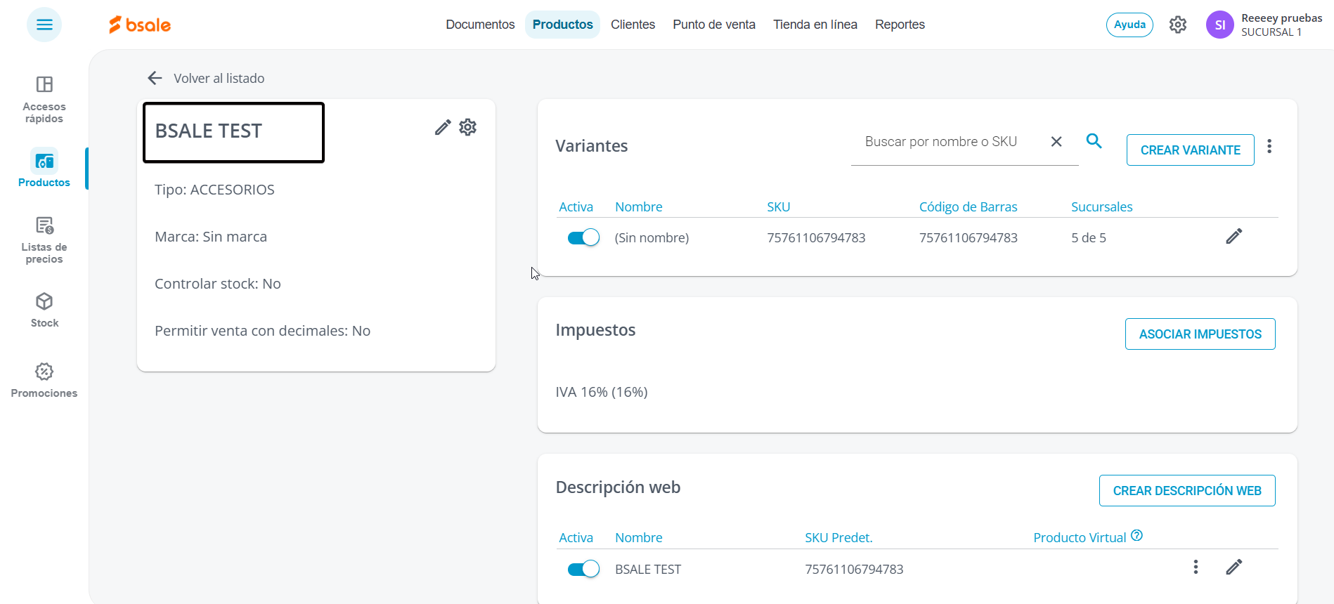 1. Crea un producto en Bsale. Recomendamos usar el nombre Bsale Test (No Ofertar).
