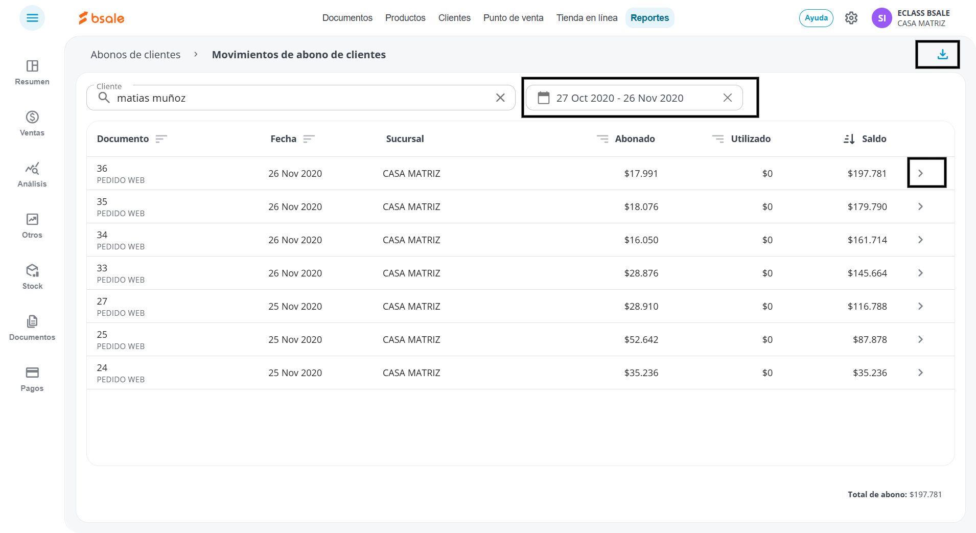 - En la parte superior de la tabla del Reporte de abono, haz clic en el botón Descargar.