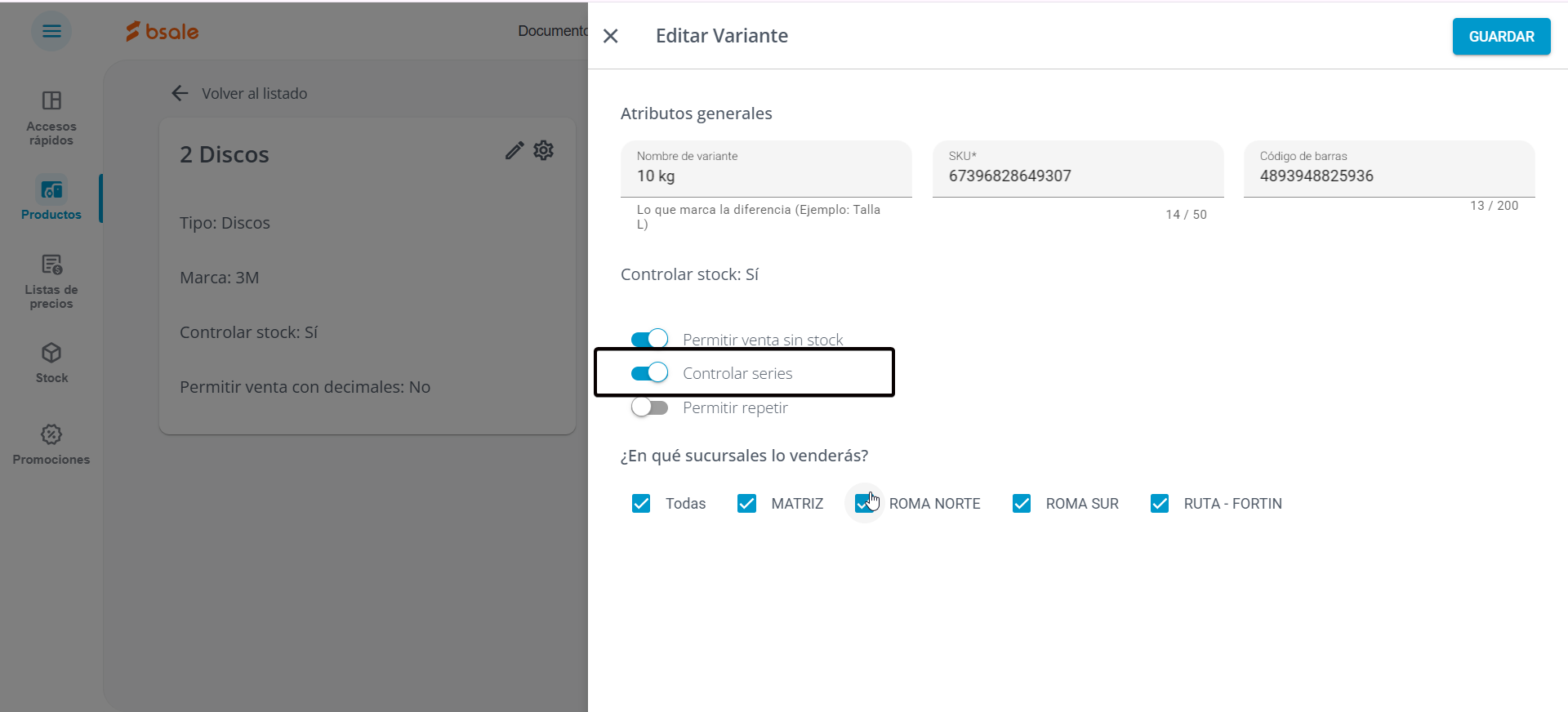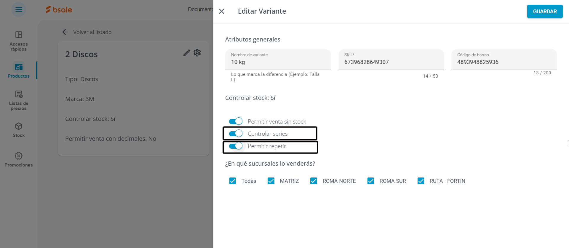 Si quieres vender un producto como lote, se deben activar las opciones Controlar serie y Permitir repetir. Con esta configuración podrás recepcionar muchas unidades de un producto con una serie que el sistema entenderá como lote.