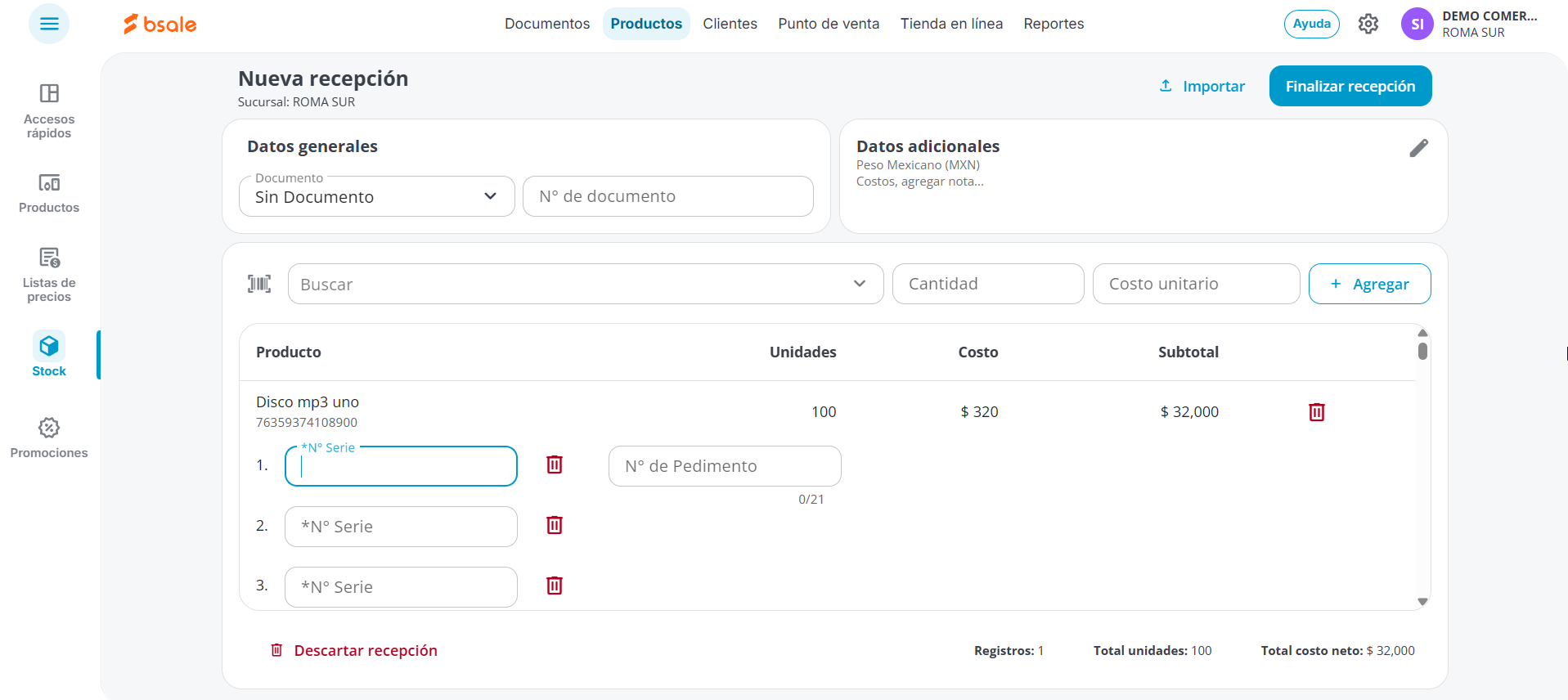 Recepción de productos con serie