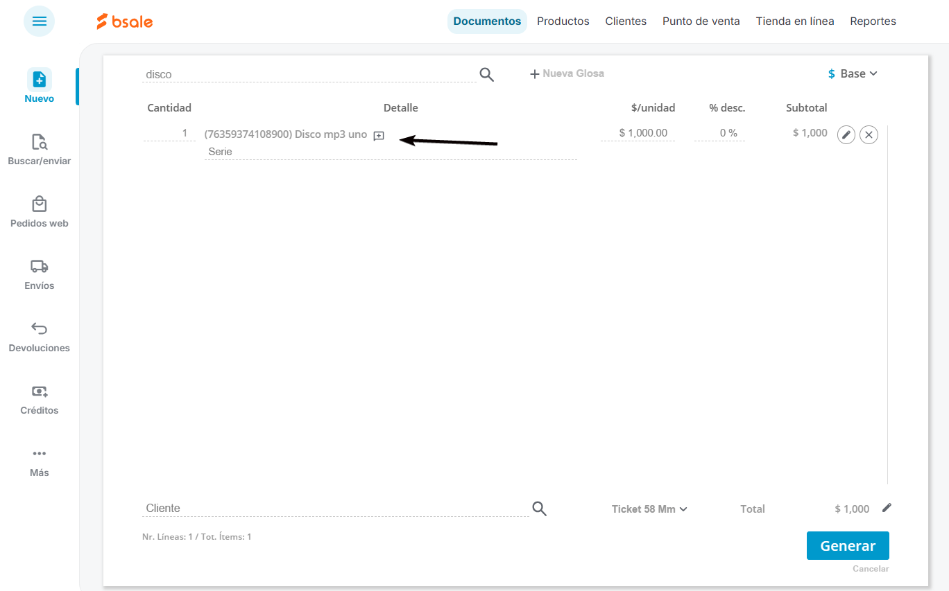 La venta se puede realizar desde el menú Documentos o desde el Punto de venta. Una vez que hayas agregado los productos el sistema te pedirá indicar la serie que se venderá. La serie la agregas haciendo clic en el símbolo + ubicado al lado del nombre del producto.