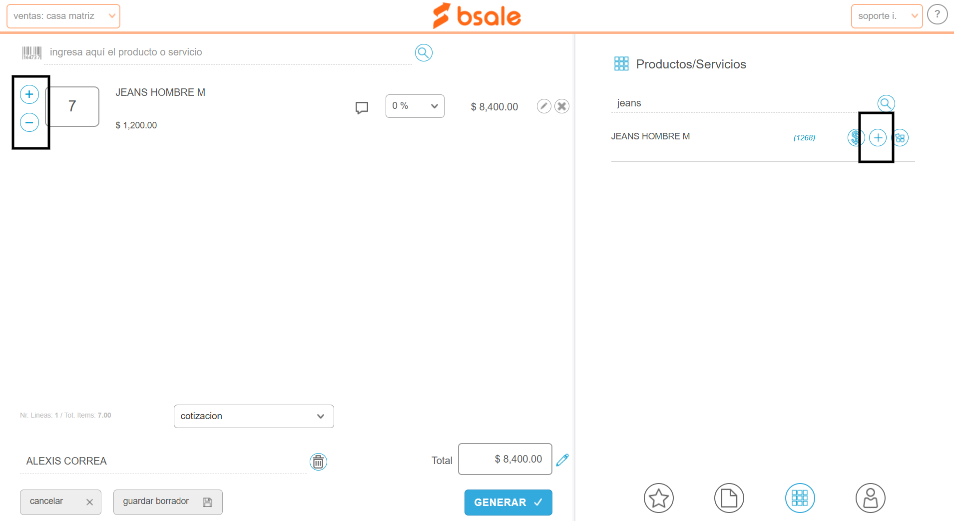 En la parte derecha de la pantalla aparecerán los productos que se ajusten a tu búsqueda. Selecciona todos los que desees. Verás que se irán agregando a la parte izquierda de la pantalla, donde además, podrás cambiar la cantidad de unidades, simplemente presionando en el botón de más o de menos en el ítem de cada producto.