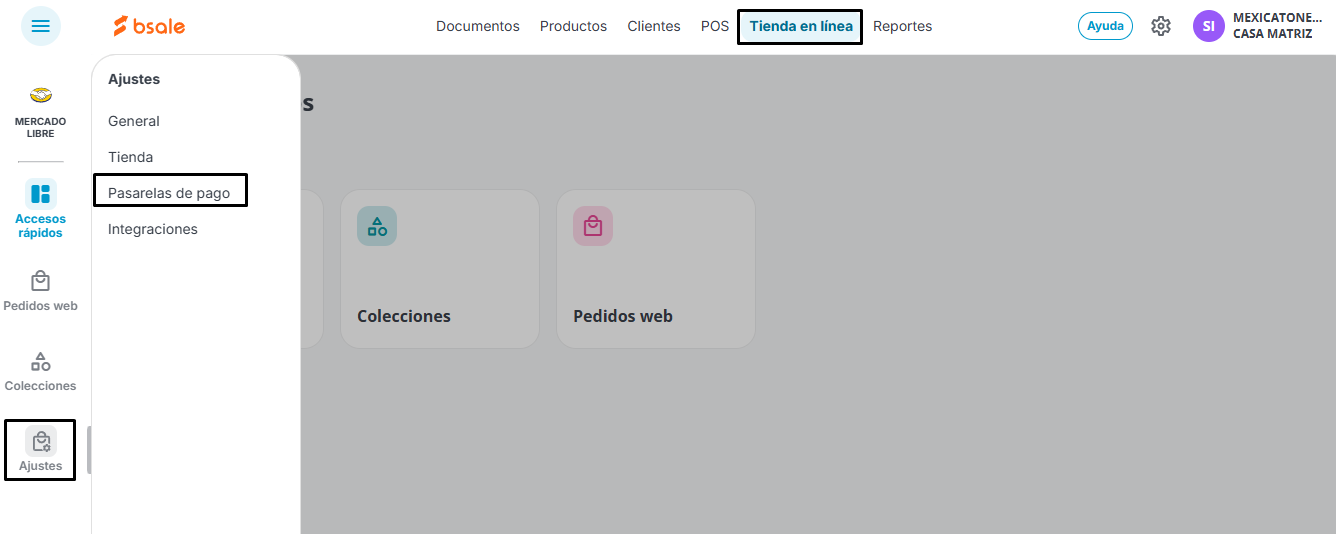 Para ingresar a este menú debes ir a Tienda en línea y luego a Ajustes. Finalmente, debes hacer clic en Pasarelas de pago.