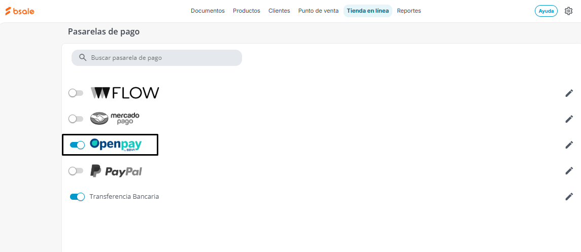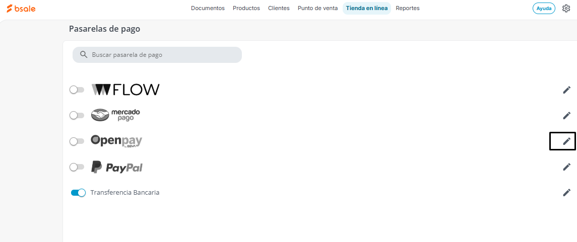 Para activar una nueva forma de pago debes darle al ícono de editar que está al lado derecho del icono de Openpay