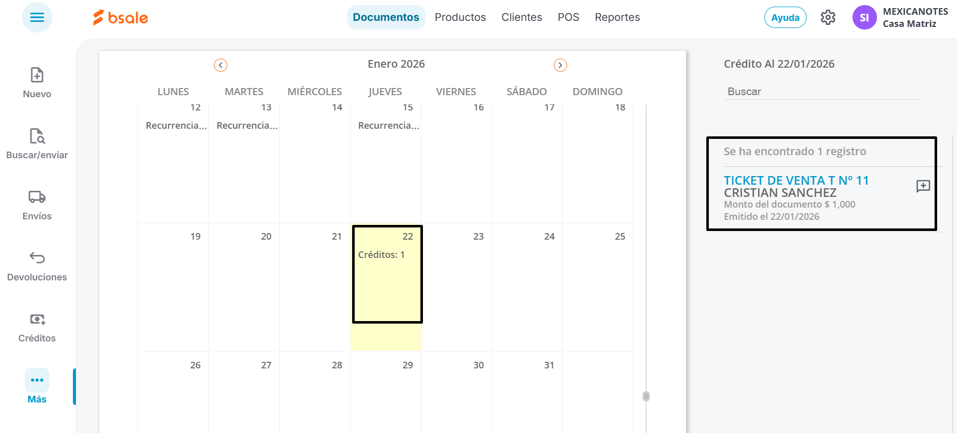 En el Calendario, se mostrarán las renovaciones pendientes de generar, documentos emitidos con fecha de vencimiento ( créditos) y podrás ver los documentos relacionados al hacer clic en el aviso marcado.