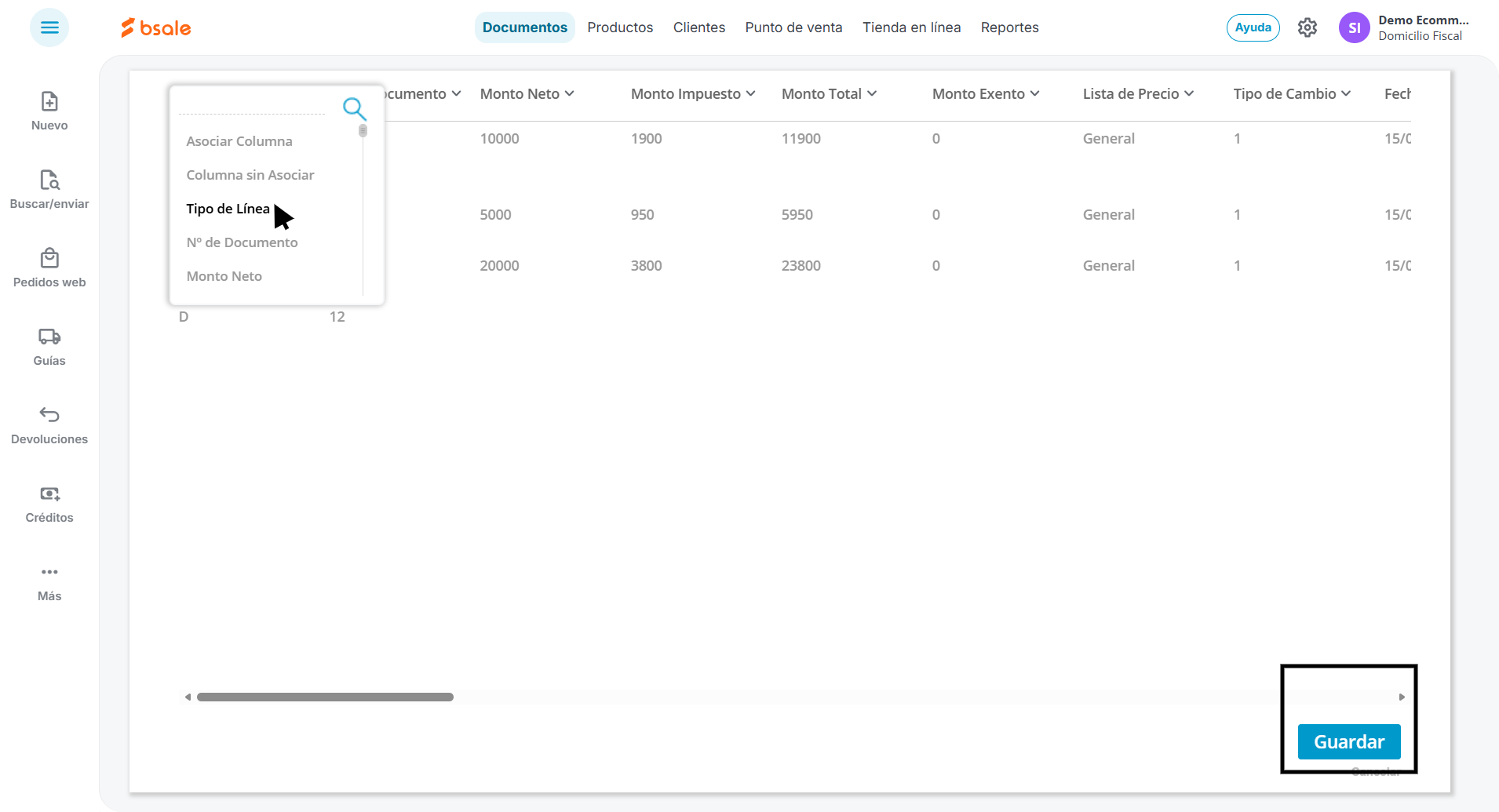 - Presiona Cargar Documentos y luego Guardar tras revisar las columnas.